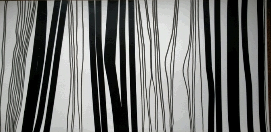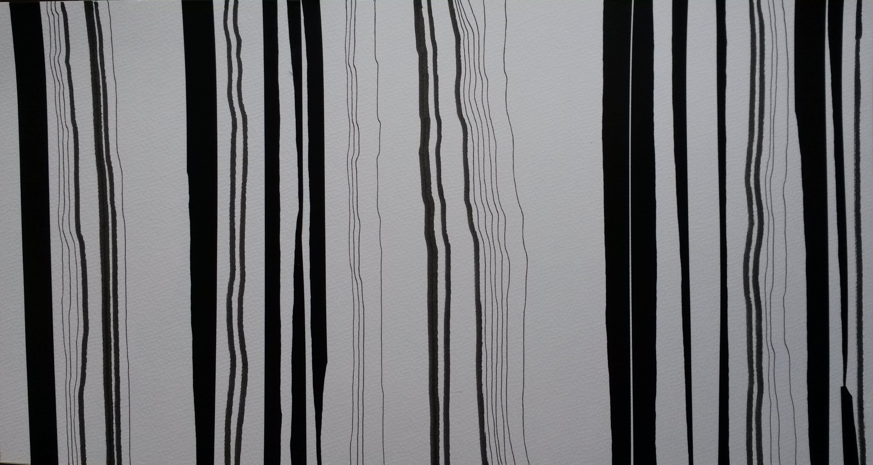 I decided on reviewing all the pieces so far, that I liked the black and white ones best, and I liked the ones with a variety of thick and thin, straight and looser lines. I decided to try the final piece in a much bigger scale. The next one was 28 cm x 53cm, on watercolour paper, and the lines were made using black electrical tape, with some parts torn to give a ragged edge, and lines drawn with black marker and fine liner.