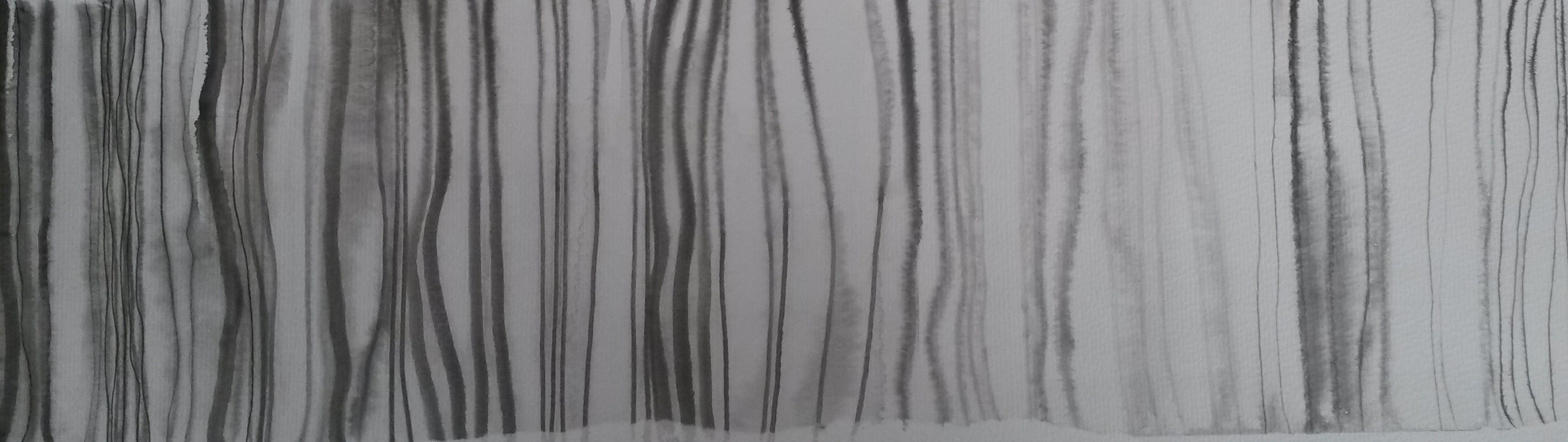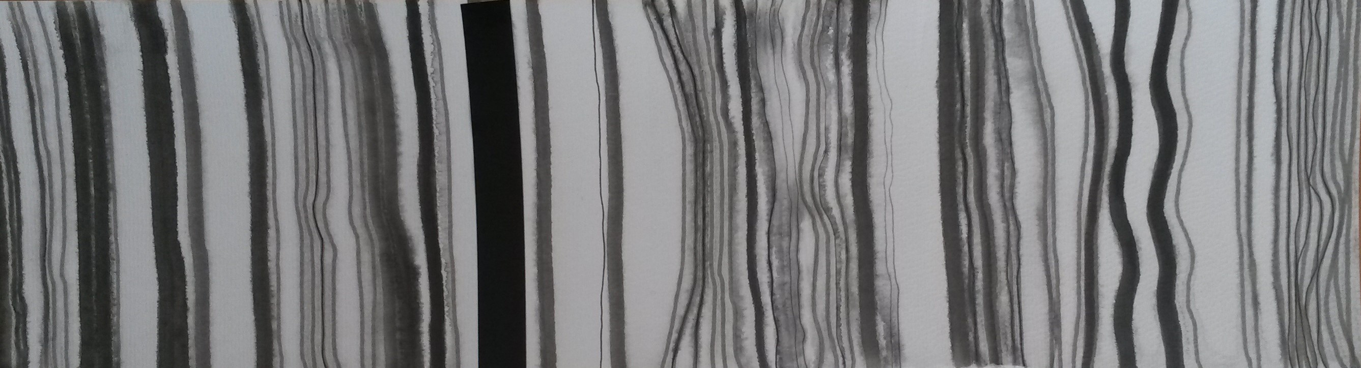 Next I decided to try it on a bigger scale. I used watercolour board 15 cm x 53 cm. I used black watercolour marker and worked in the same way as before. As before I wet the whole area afterwards and the pigment ran. Once dry I went over some of the lines with the watercolour marker again. I was becoming a little frustrated that it was all becoming grey and washed out looking and I wanted to get the dark black back, so as an experiment I added a strip of black electrical tape. Eureka, this contrasted well with the lighter wobbly drawn lines. I added some very fine lines using Pitt pen