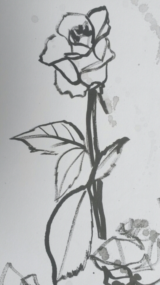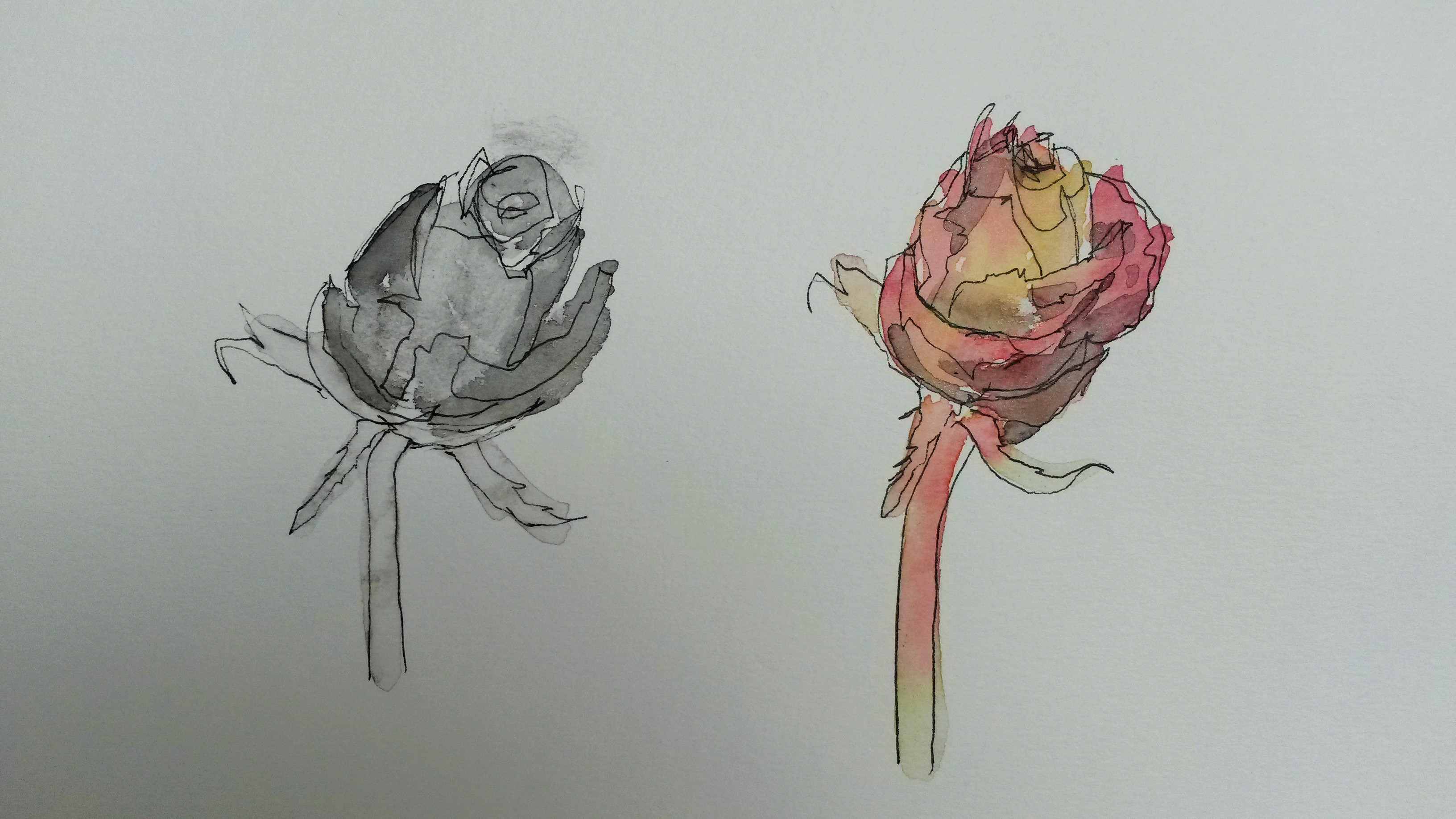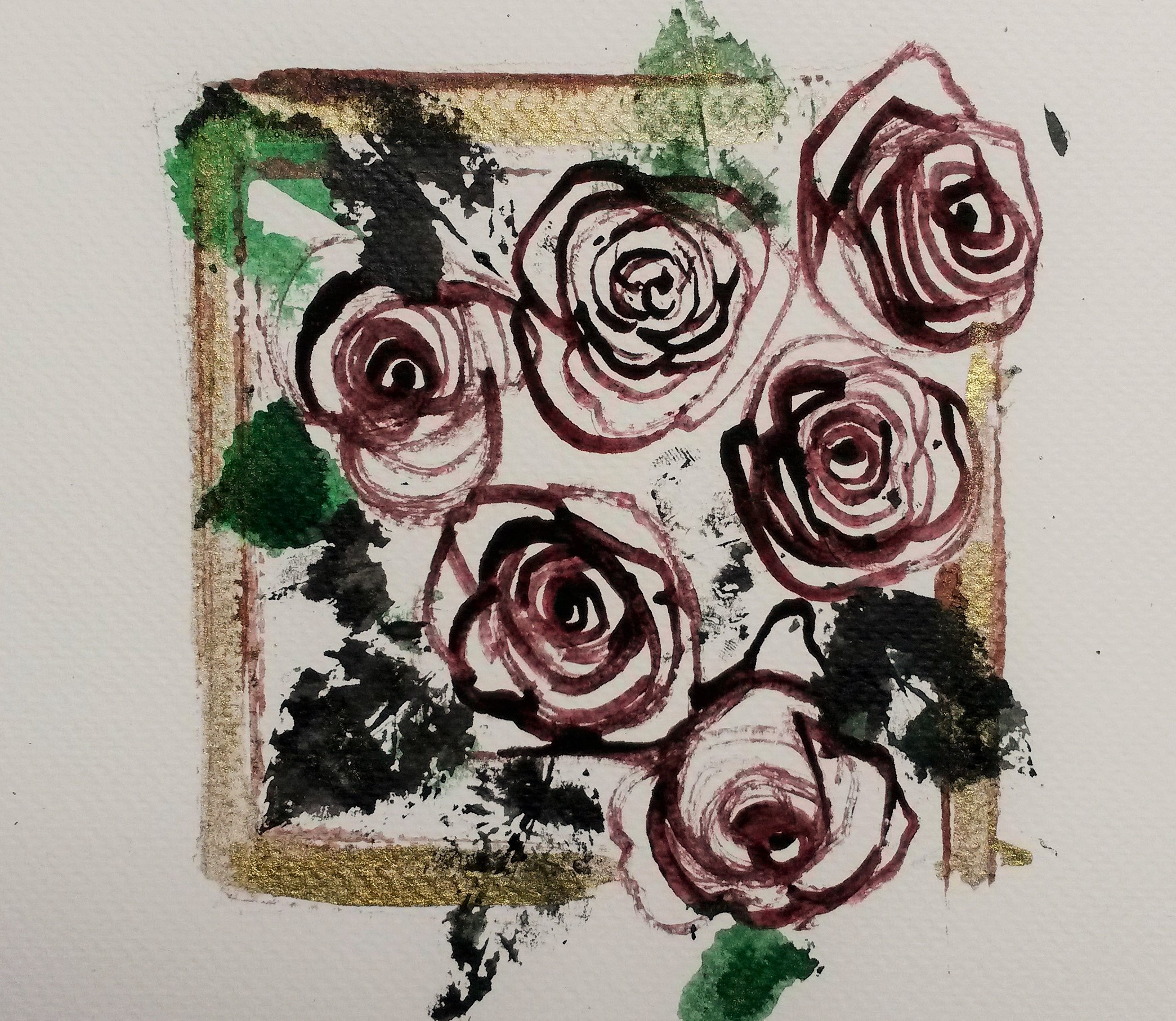 I liked the roses in this one; the darker wash adds form, but I still felt the black was too dark. I made another attempt.