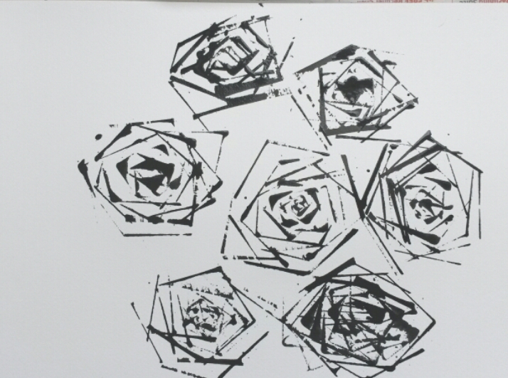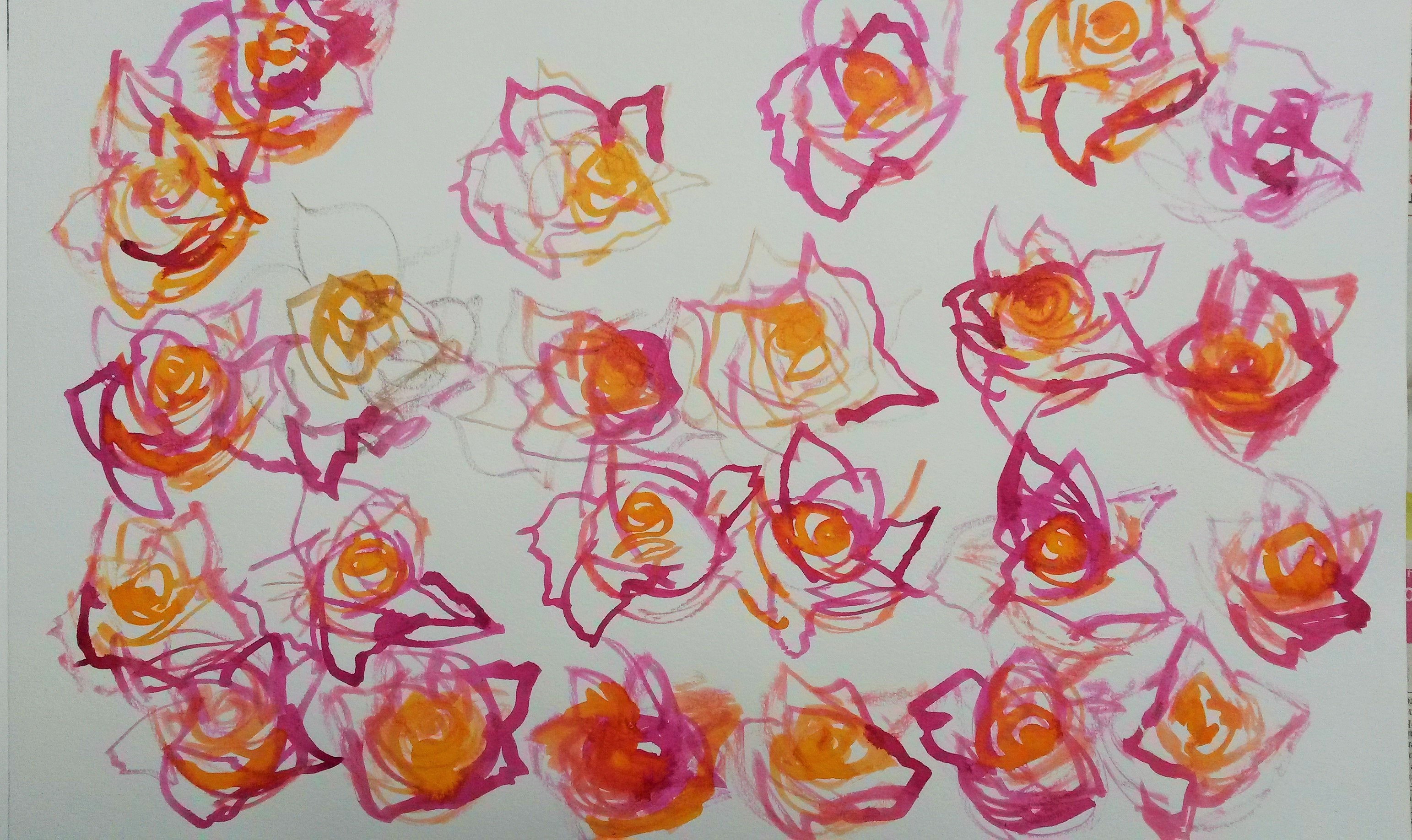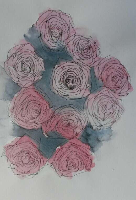 As to the success of the outcome, I find this part quite difficult to decide on. I am pleased with some elements of it; I feel I know the anatomy of roses inside out, due to the relentless sketching of them. I can draw them free hand now from my imagination. I think whilst this drawing is realistic, it has an abstract feel to it. I love the printed leaves and the marks they make. I like the view-point of the composition, looking down onto the roses, allowing you to see the concentric circles, and repetition of patterns. The black lines remind me of rose tattoos, and the image of a rose to me symbolises Love.