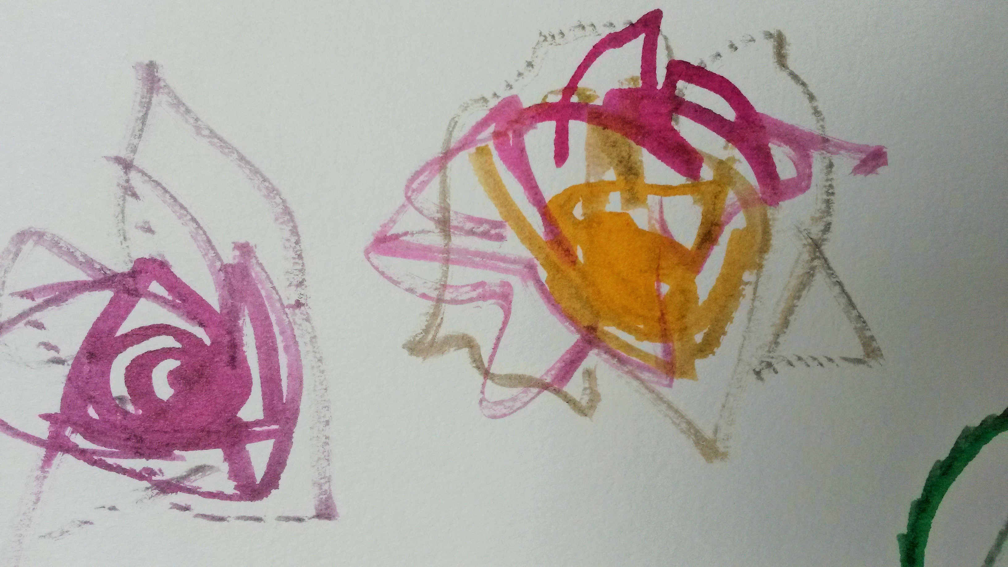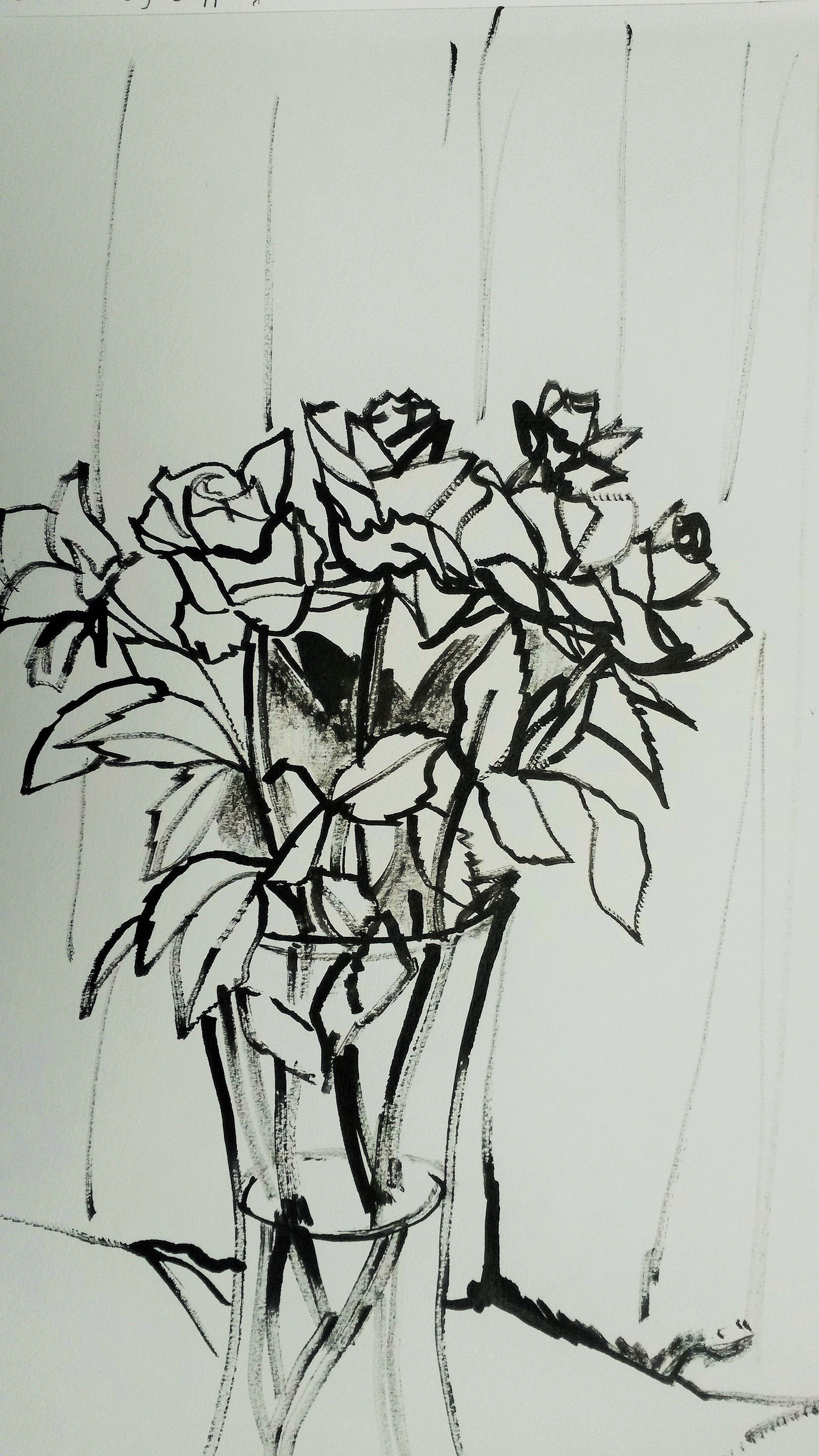 I thought that perhaps if I went to back to drawing from life it would help, so I bought new roses and tried putting them in a square vase. From this I did the sketch below.