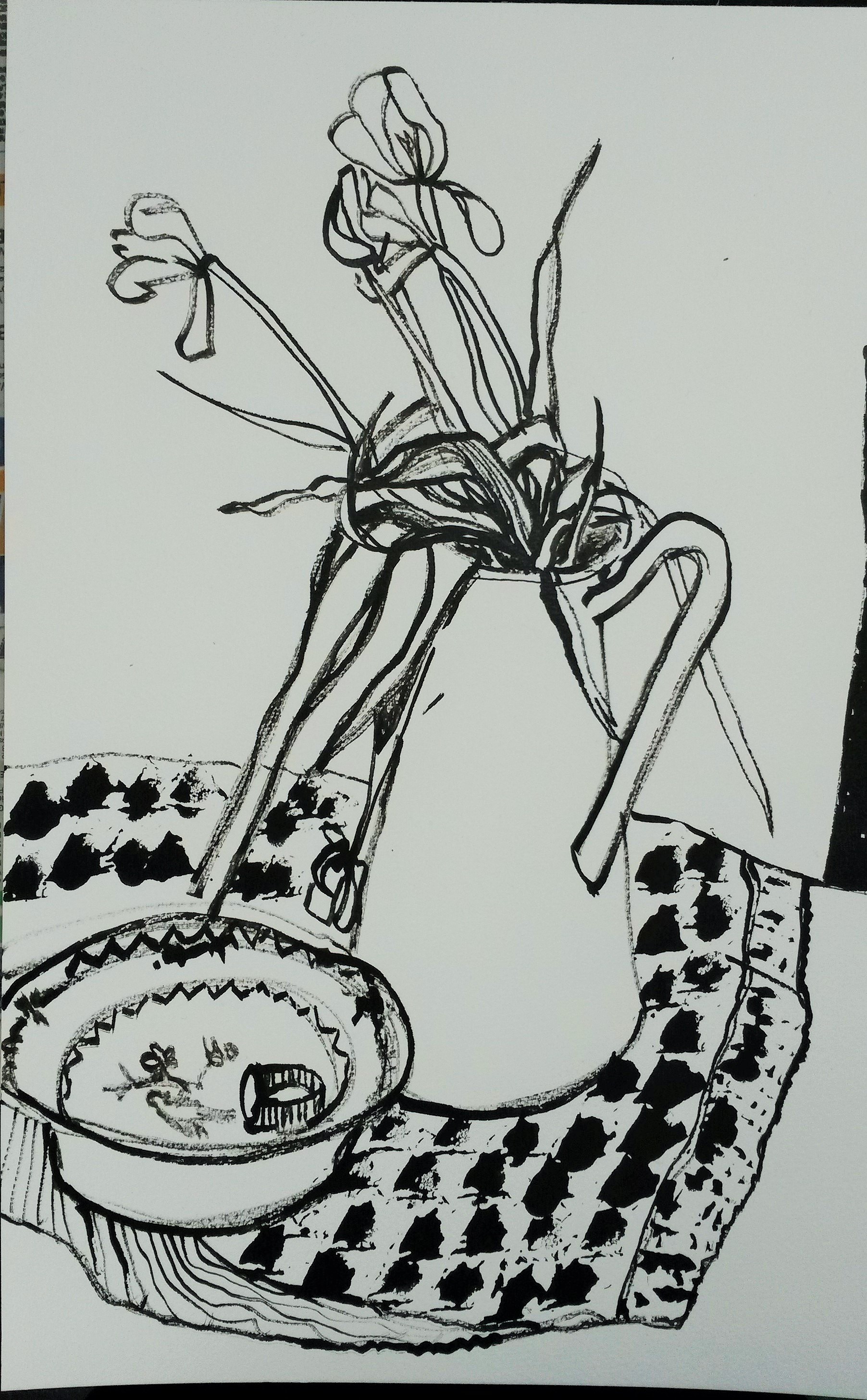 I set up a simple still life. I still had the tulips, which were dying by now, but I drew them anyway because the drooping flowers added more interest. I used a tulip stem dipped in black Winsor and Newton ink to draw the flowers. For the pattern on the cloth beneath the jug I used a rose petal dipped in ink, repeated to represent a patterned cloth. It wasn’t immediately obvious from looking at this that I had used anything other than a dip pen and the lines weren’t very delicate, instead they were quite heavy and most un-flower like.