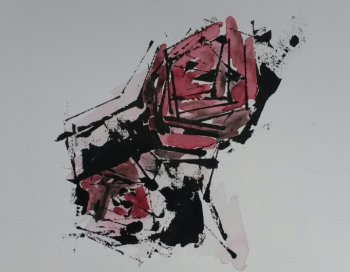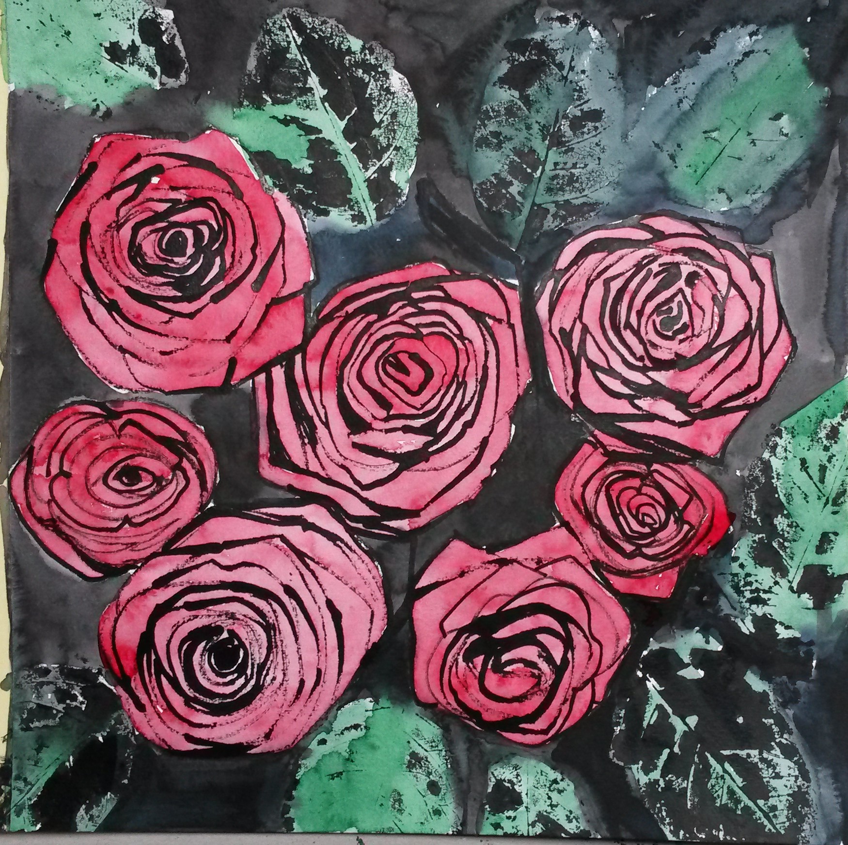 I enjoyed the new experience of making drawing tools from flower stems, although to be honest I would probably have been happier drawing with the predictability and familiarity of a boring old pen. I experimented with drawing a black and white composition as opposed to one in colour and used complimentary colours; red and green. I experimented with the use of printing with leaves, a process that I really enjoyed. I tried different compositions until I decided on the view-point looking down as opposed to a conventional scene at viewed from the side. I used my experience of painting with watercolour to try wet into wet washes, runs and spatters with ink and paint, which contrast well with the tight drawing of the roses. I abstracted the rose forms and emphasised the patterns of the petals. I don’t know that I have a personal voice yet. I do know that I really like the precise, controlled line achieved when drawing with fibre pens, and perhaps this is a step in the right direction for me.