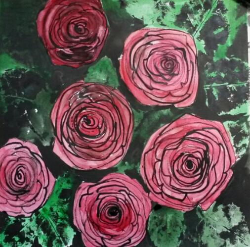 The technique I used was pretty much as directed in the brief. Reading it again, perhaps I could have been more experimental with the tool making and tried other parts of the roses or other plants. I also tried experimenting with drawing roses with straight lines using the credit card. I did vary the pressure I used when drawing in order to try to vary the thickness of the lines. I think I used good observational skills for the roses. I tried a few different compositions, originally starting with a still life of tulips before moving on to the roses with a view-point looking down on the roses. The limited palette of complimentary colours red and green makes the roses stand out, as does the contrast between the tight, controlled forms of the roses and the looser, messier foliage.