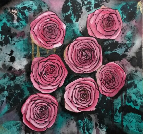 I then began adding watercolour. I used Viridian for the leaves. I worked wet into wet and added Neutral for a deeper tones. Even before I added the red for the roses I realised that if I didn’t use the same red in the foliage and background, the roses would look ‘ stuck on’, and not part of the rest of the painting. I added some red to some of the leaves and mixed Viridian with Alizarin Crimson for some of the shadows. This gave it more cohesion. I added some gold ink as well, because it worked well in the little sketch I did. Also, way back in the recesses of my mind, I had a vague recollection of my wedding invites having a rose printed on it with some gold on it somewhere. I purposefully made some runs with the paint (remembering Project 3; Narrative), which adds a touch of sadness, and splattered some black ink to break up the background a little.