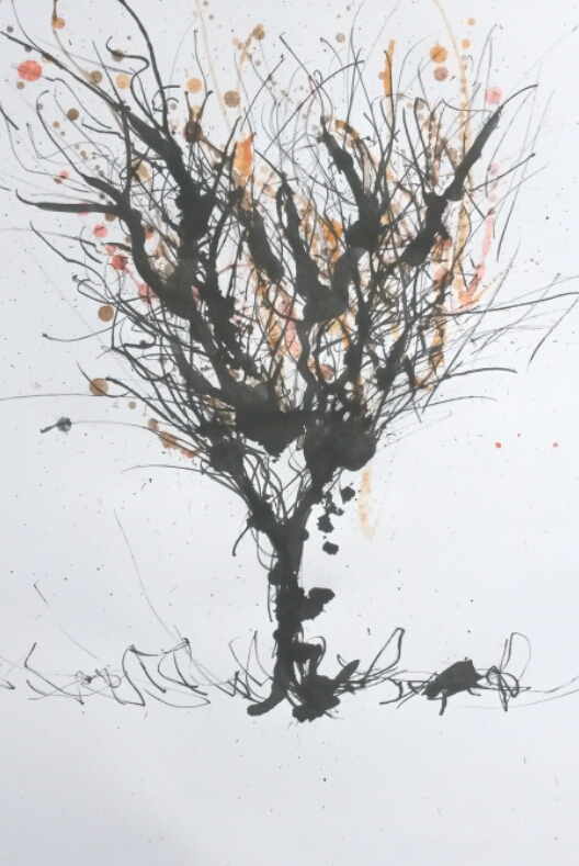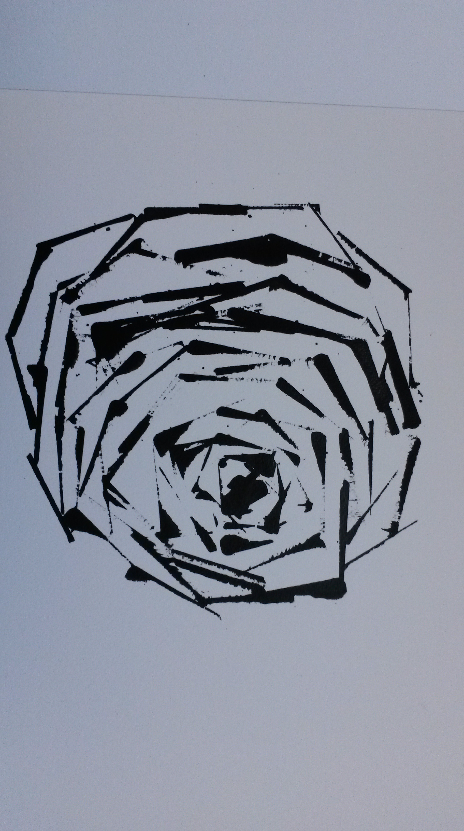 This was made by splashing black ink on the paper, then rendering marks with the wooden handle of a paint brush. I felt I was getting somewhere.