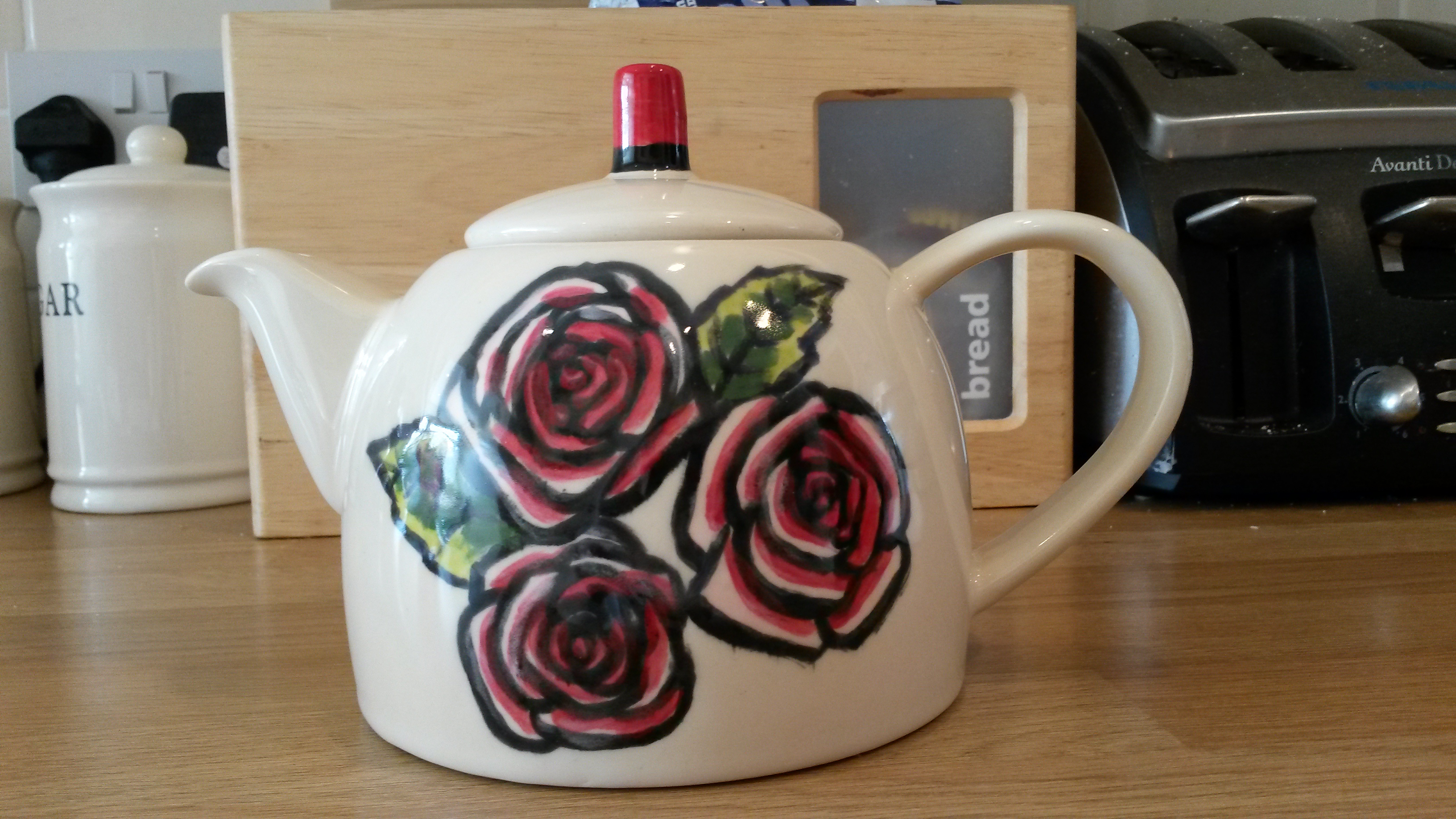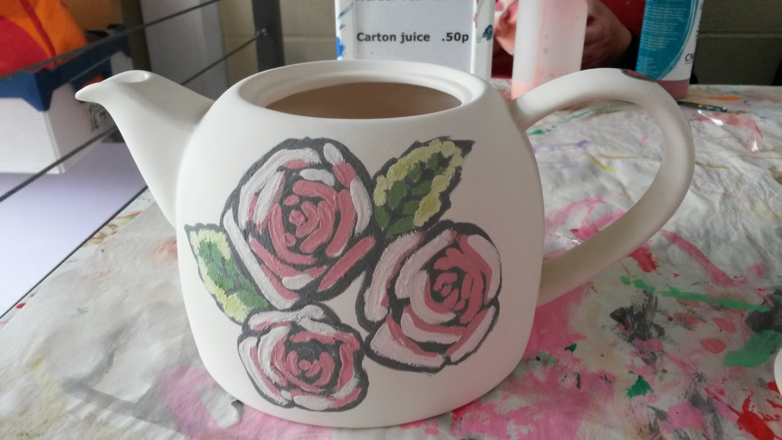 I took my daughter to a pottery painting place in the summer holidays and noticed they did glazed china painting too. I came back at a later date and painted a tea pot using my painting for Assignment 2 for inspiration.