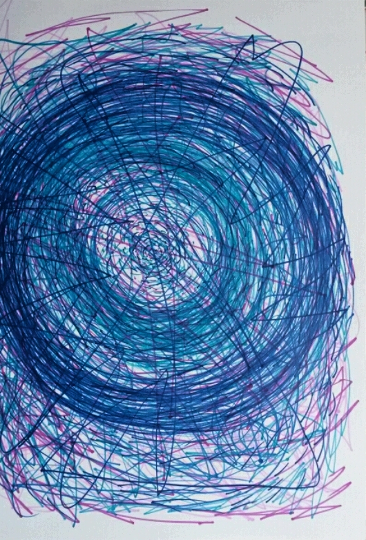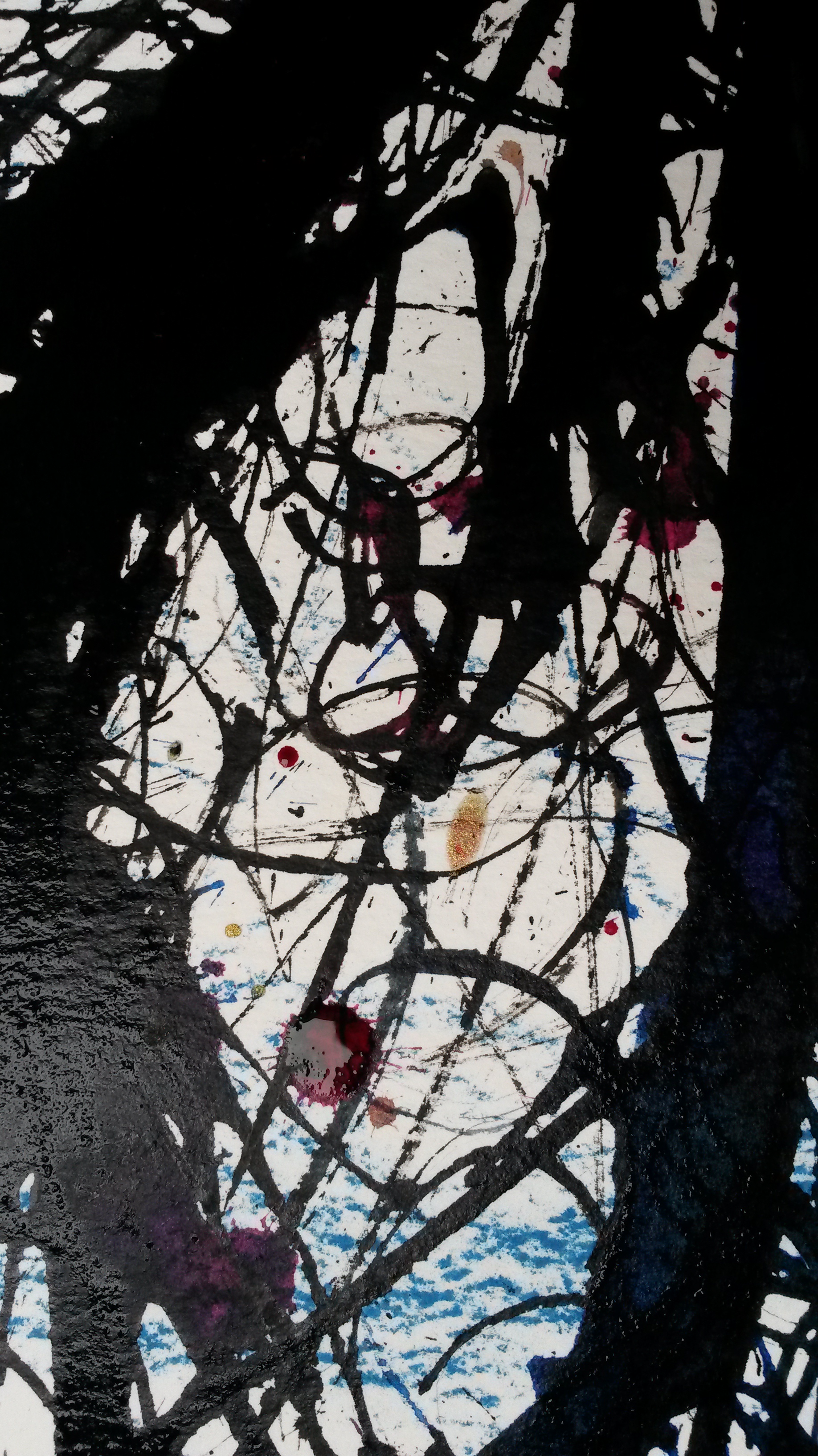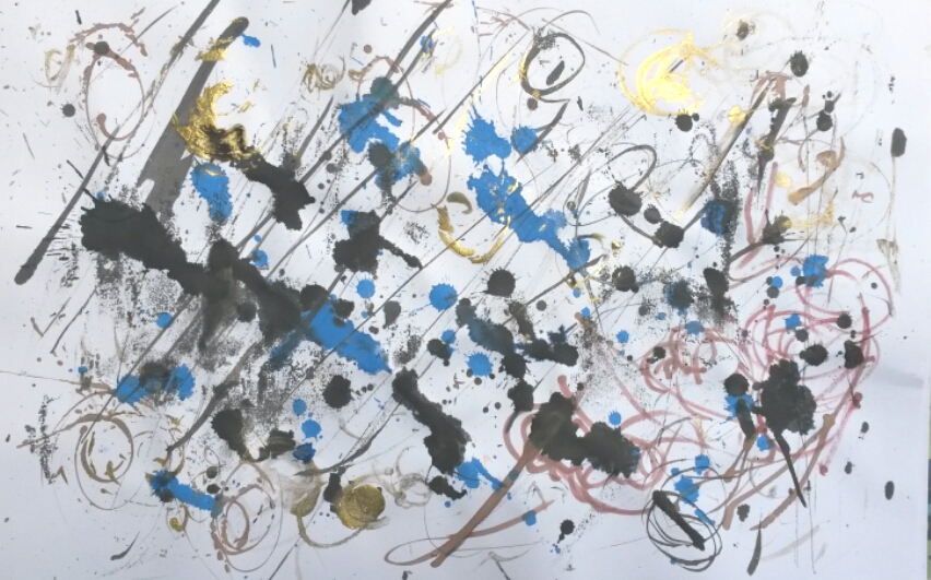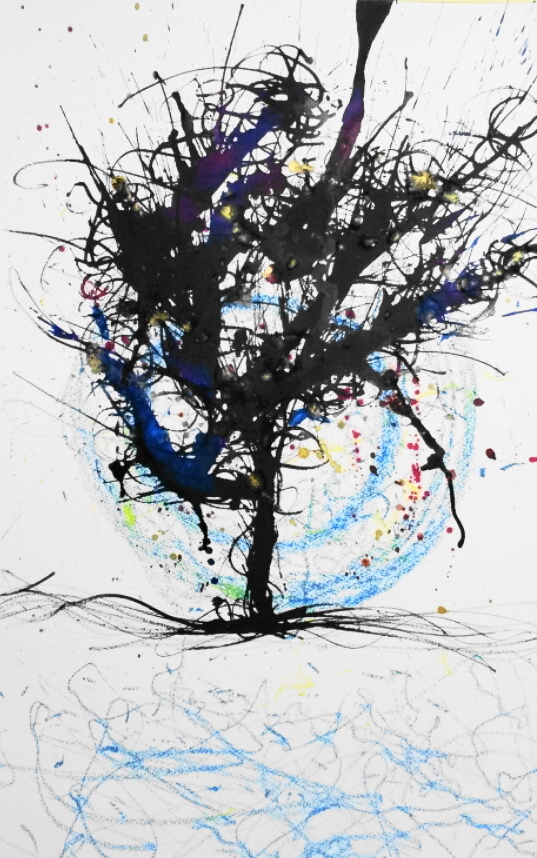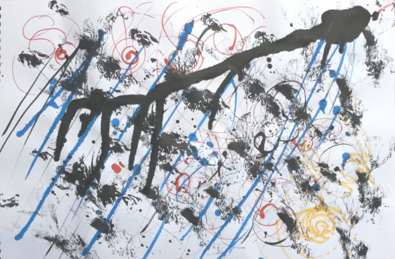 This was done by grabbing a fist of different coloured pastels and responding to the rhythm of the music. Then I splattered some black ink on and drew into this with the handle of a paint brush.