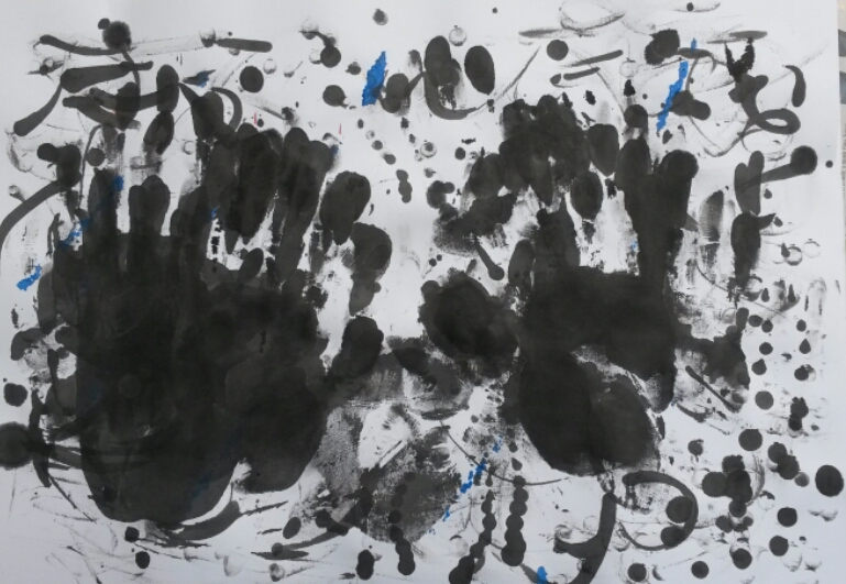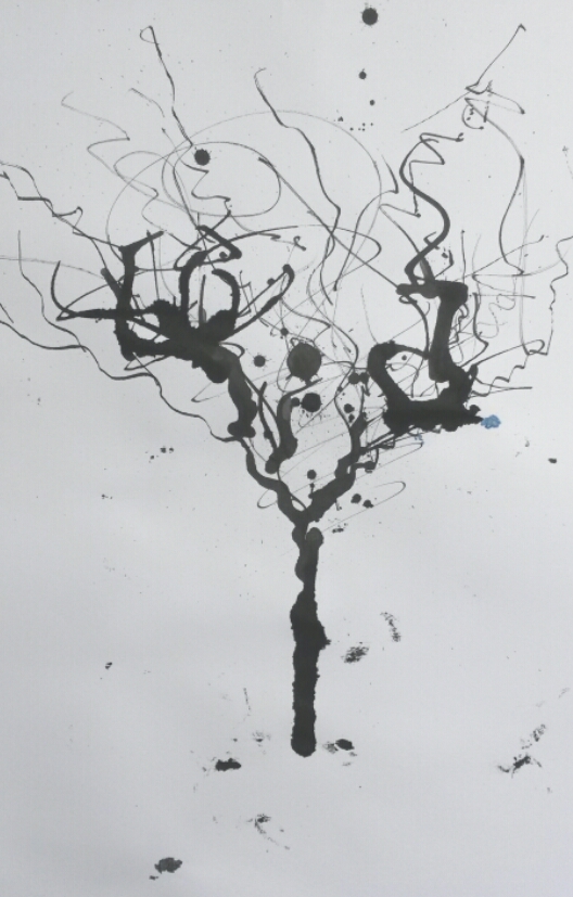 Then I tried felt tip pens. Perhaps the ‘drawing machine’s’ work was too fresh in my mind, as it was mostly circles that I produced. I was feeling very frustrated at this time because I couldn’t picture anything when listening to the music. I enjoyed listening to it and felt emotion but didn’t know how to translate this into a drawing. The contrast between black and white has worked well for me so far in this course, so I decided to play about with some black ink. The fluidity would respond better than a pen. I also thought about the video I had watched of Jackson Pollock painting and I thought about the rhythm and flow in his gestures and movements.