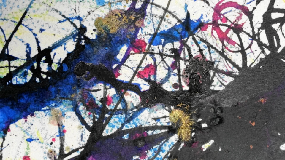 I used a similar process for this one, adding more colours to make it more interesting; sepia, blue, gold and pink. The process reminded me of the work of Jackson Pollock.
