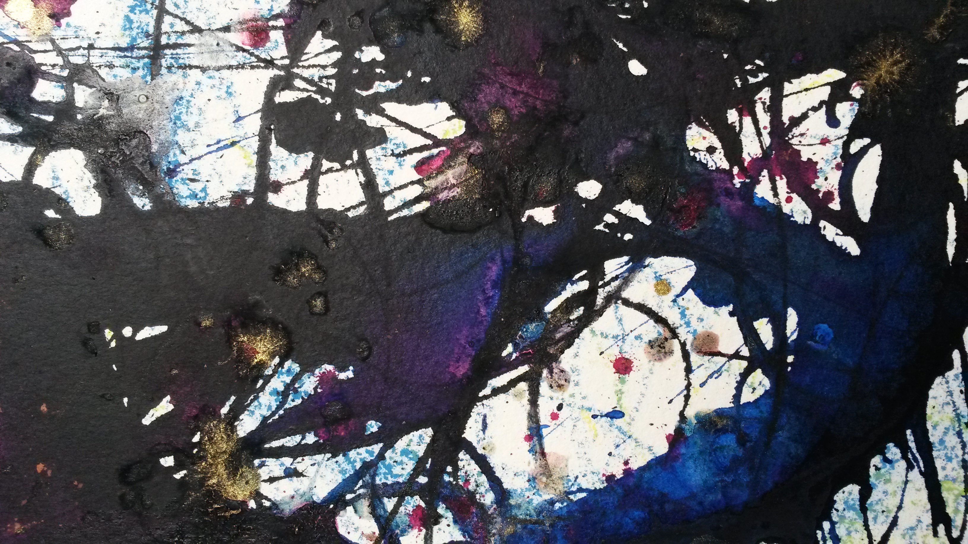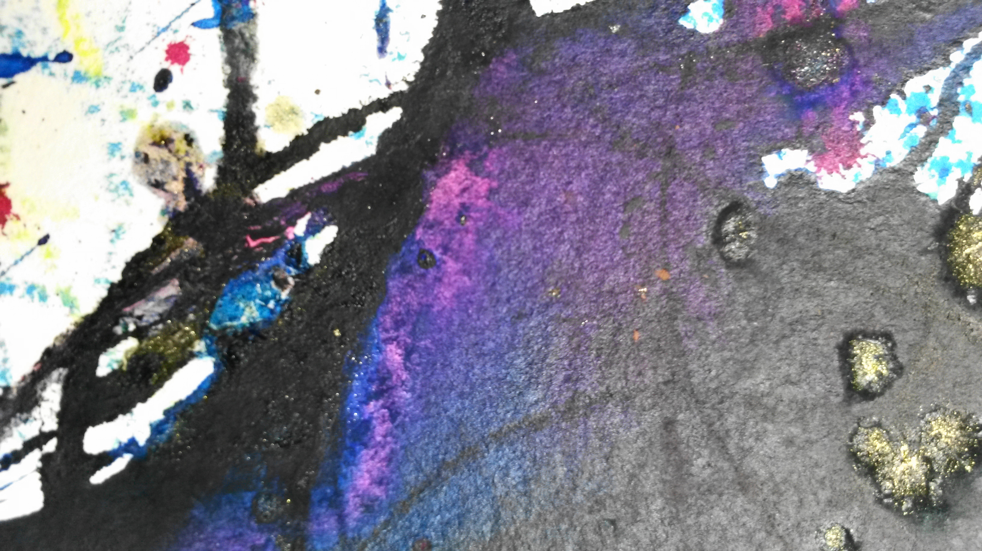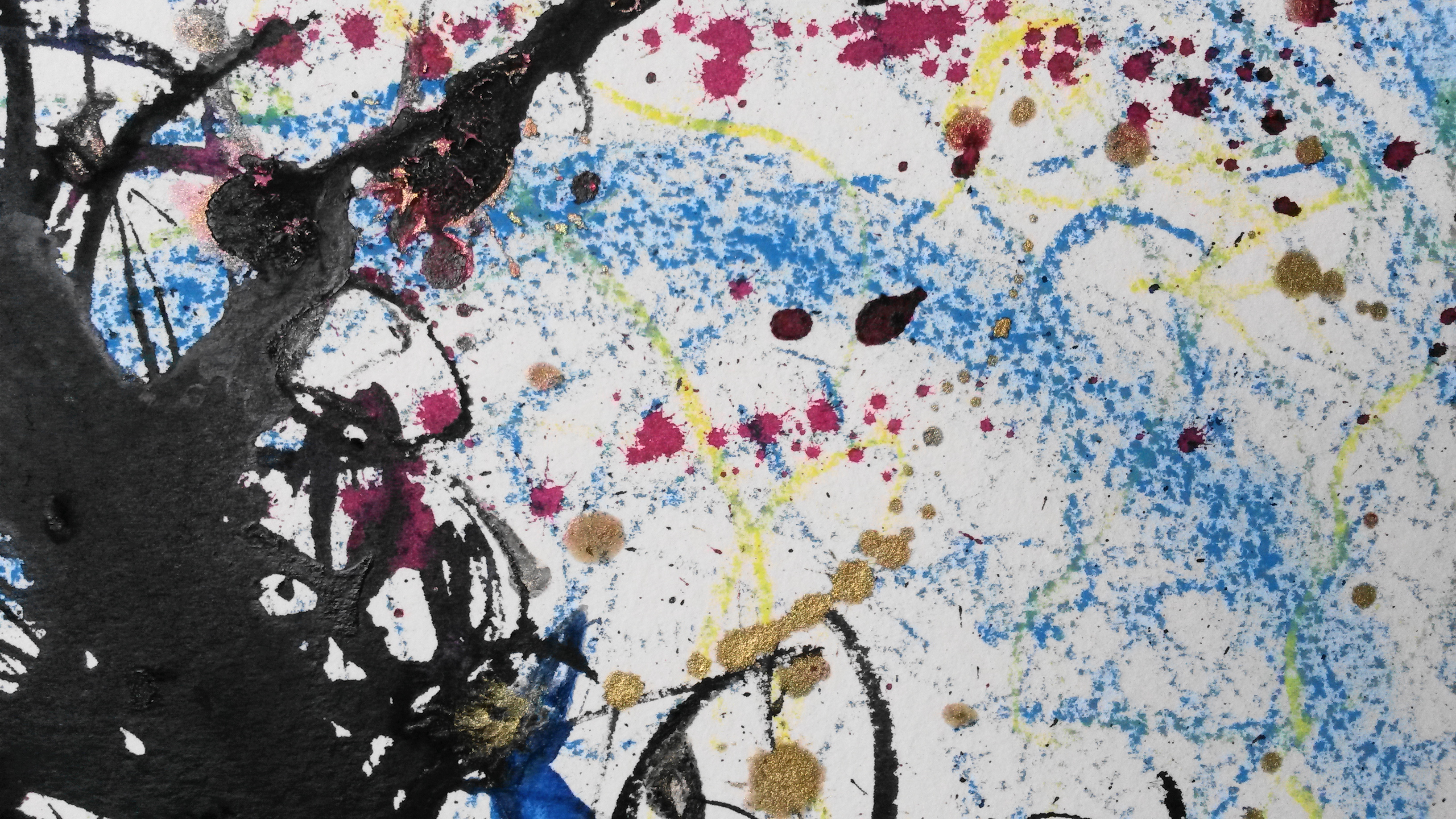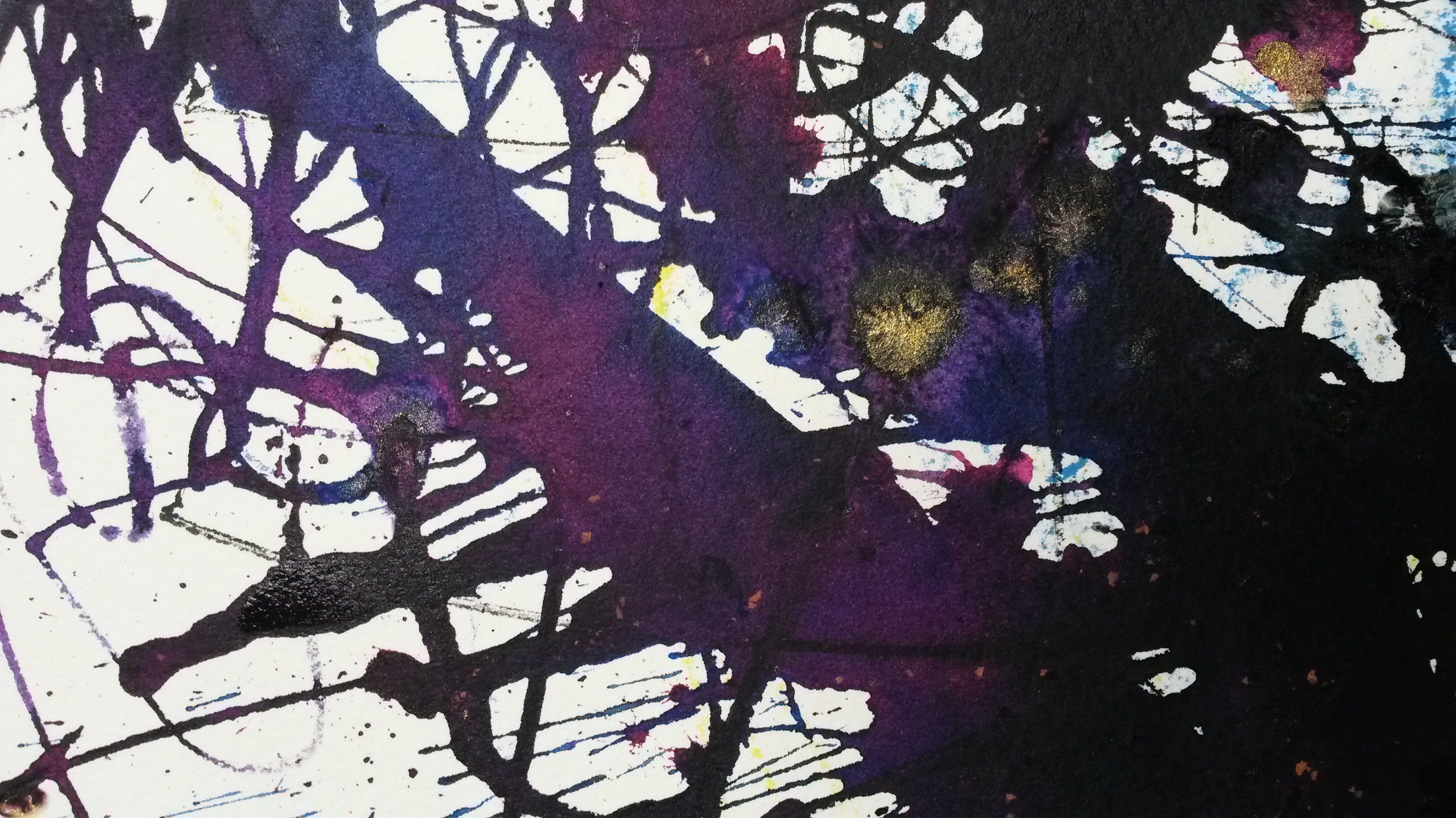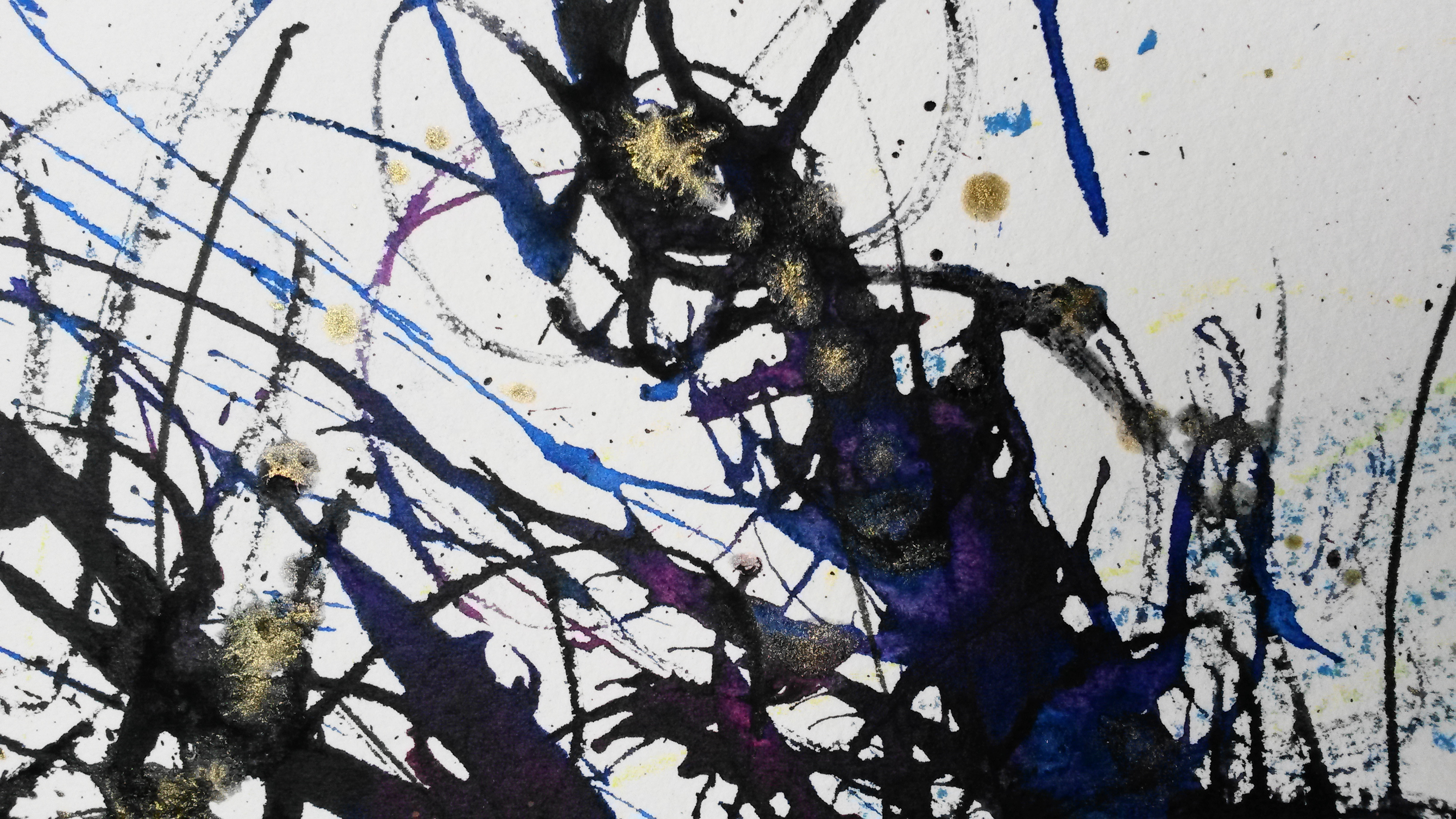 I made up little washes of watercolour and threw them on in time to the music. I chose the colours with Autumn in mind, but on reflection I decided I didn’t want natural colours; it wasn’t a natural, realistic result I was aiming for, I think the process merits more mysterious, magical colours, such as blue and gold. I also thought the colour in the watercolour washes wasn’t strong enough to compete with the black ink, so decided to use coloured inks in the next ones.